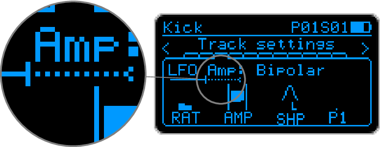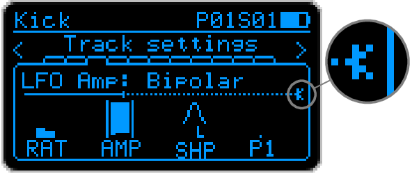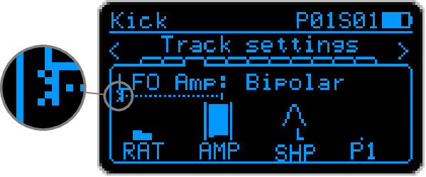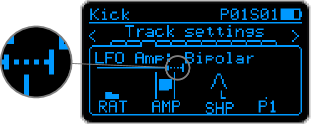 On the LFO page, when a target is selected, an LFO visualization bar is displayed. A continuous line, starting from left of the screen, shows the current base value of the target parameter. On top of it, a dotted line shows the effect of the LFO on the target parameter.